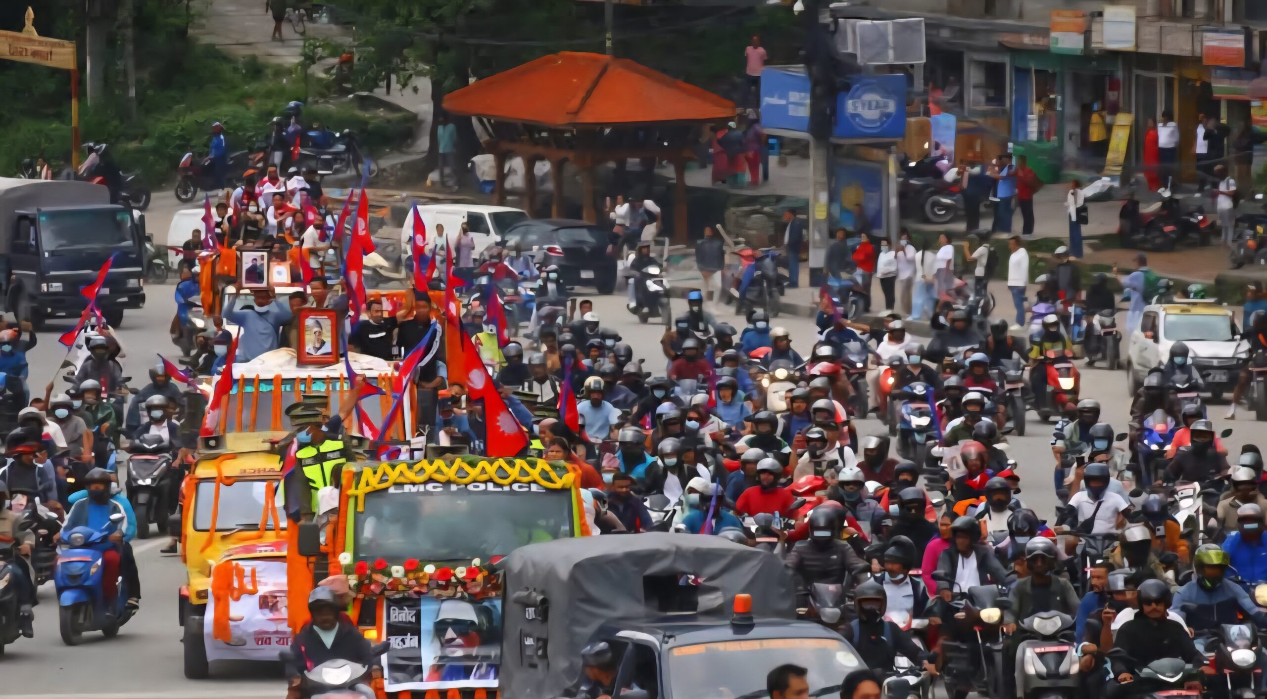 Ordinary citizens, family members, and friends walked in silence and sorrow, carrying garlands, flowers, and placards. Their cries of “Bir Shaheed Amar Rahe” (Long live the brave martyrs) echoed through the streets.The funeral march was also joined by motorbikes draped in the national flag, their riders shouting slogans of “Long Live Nepal” in solidarity. Shops along the route downed shutters, and local residents stepped out to pay their respects with folded hands as the procession passed by.